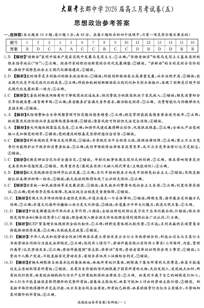 长郡中学2026届高三月考试卷(五)政治答案.pdf