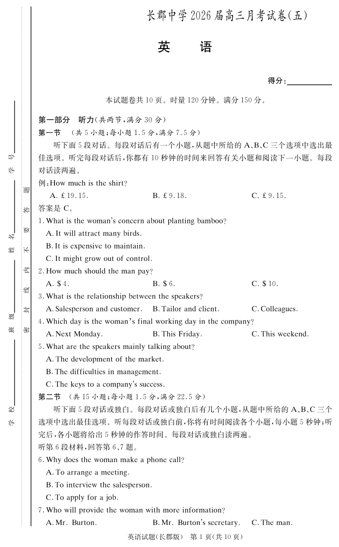 长郡中学2026届高三月考试卷(五)英语.pdf