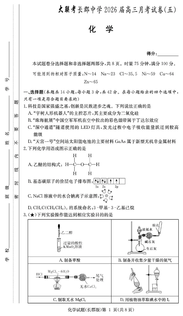 长郡中学2026届高三月考试卷(五)化学.pdf