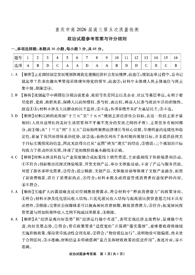 重庆市南开中学高2026届高三第五次质量检测 政治答案.pdf
