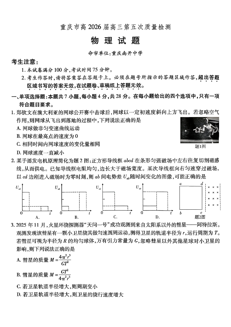 重庆市南开中学高2026届高三第五次质量检测 物理.pdf
