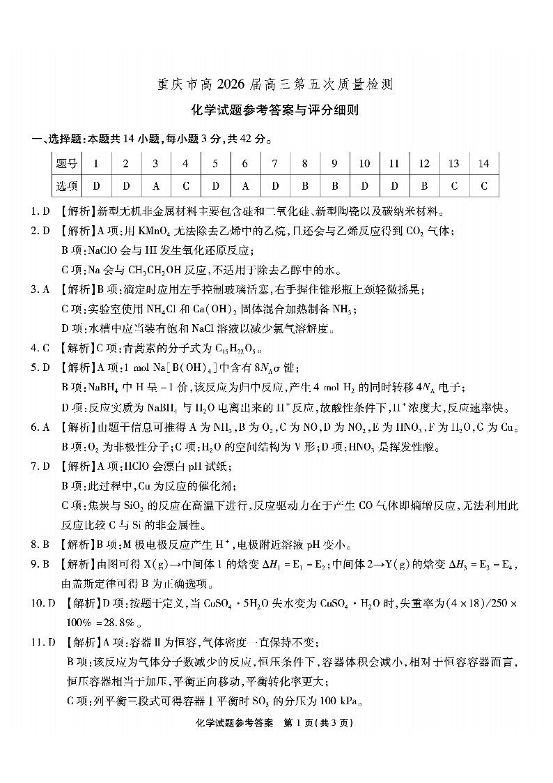 重庆市南开中学高2026届高三第五次质量检测 化学答案.pdf