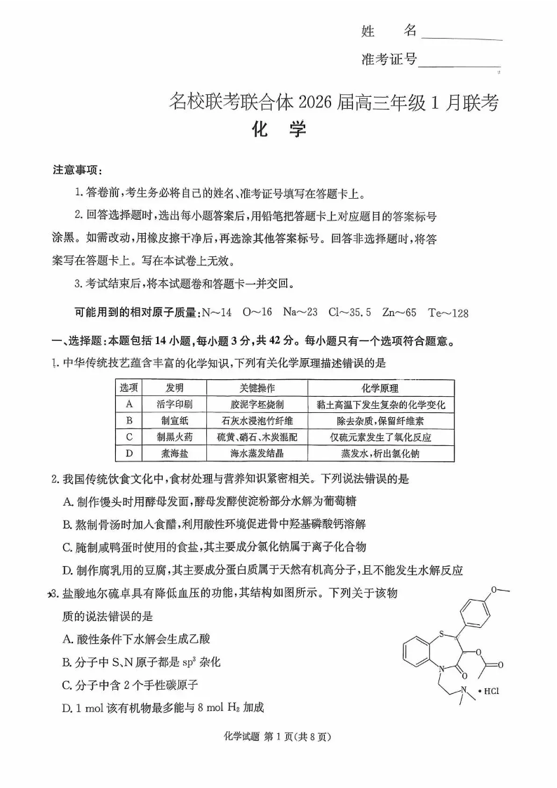 湖南省名校联考联合体2026届高三年级1月期末联考 化学.pdf
