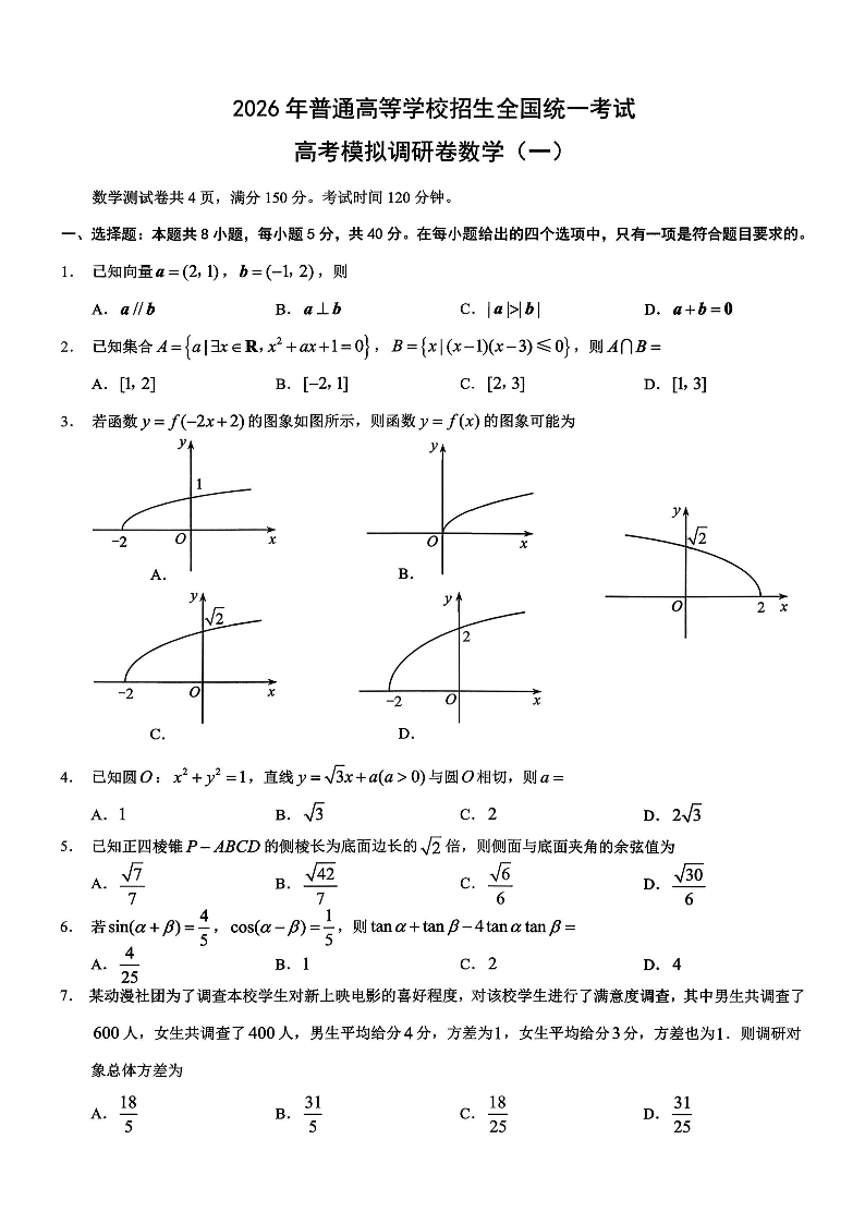 2026年重庆市普通高中学业水平选择性考试高考模拟调研卷(一)数学试题(含答案).pdf