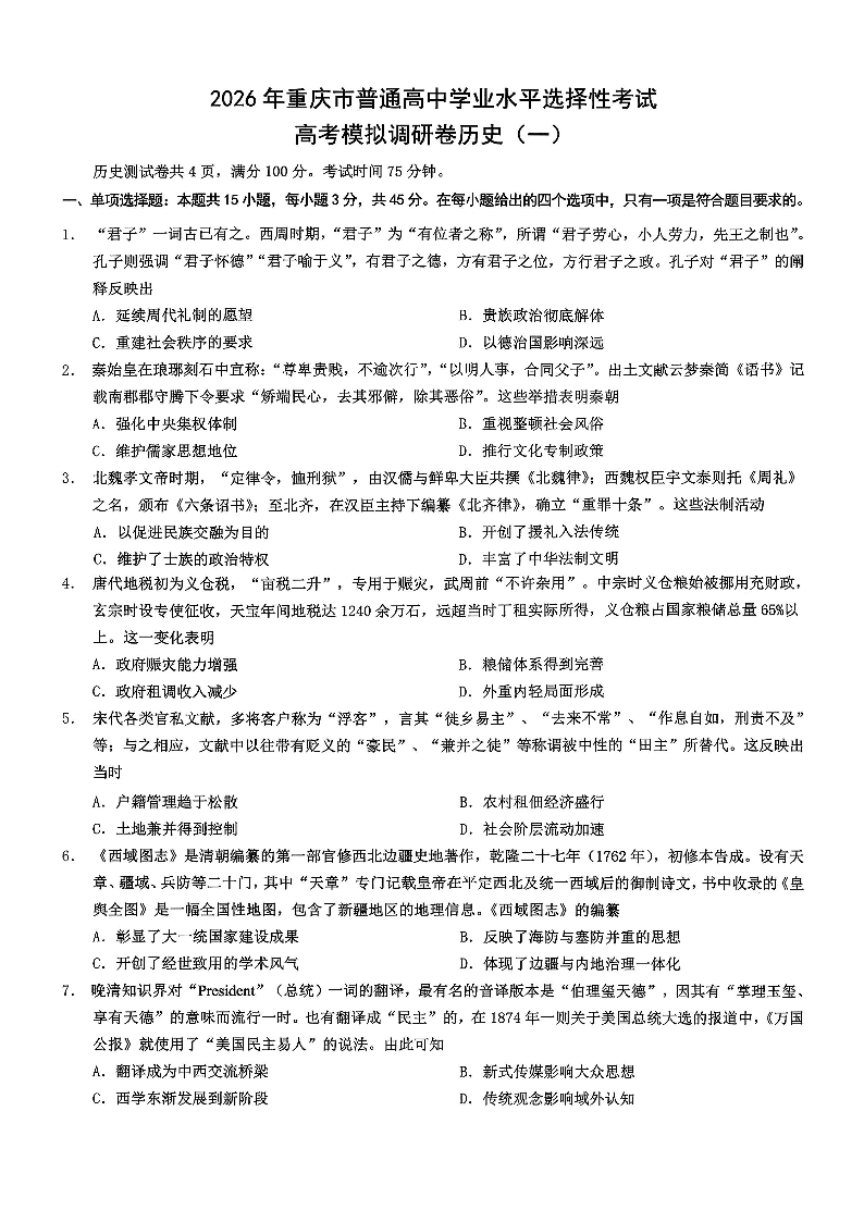 2026年重庆市普通高中学业水平选择性考试高考模拟调研卷(一)历史试题(含答案).pdf