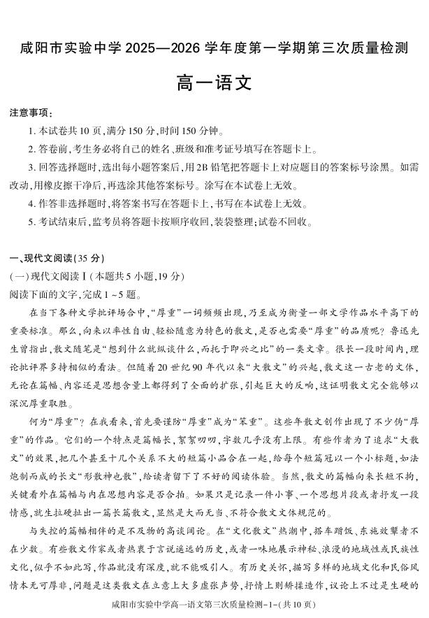 咸阳市实验中学2025-2026学年高一上学期第三次质量检测 语文答案.pdf