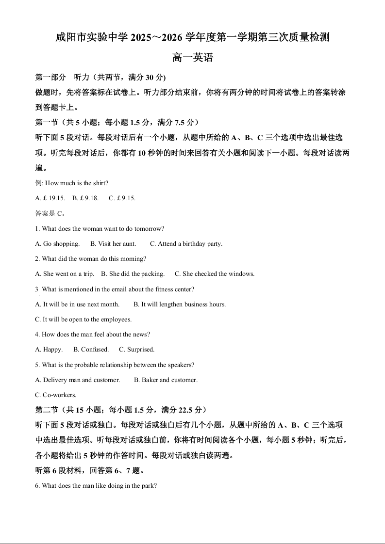 咸阳市实验中学2025-2026学年高一上学期第三次质量检测 英语.docx