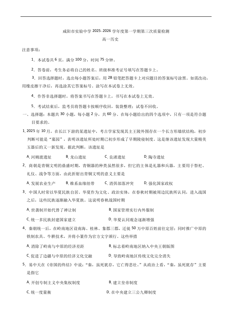 咸阳市实验中学2025-2026学年高一上学期第三次质量检测 历史.docx