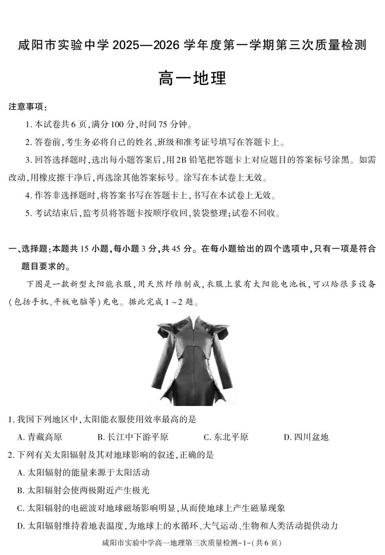 咸阳市实验中学2025-2026学年高一上学期第三次质量检测 地理.pdf