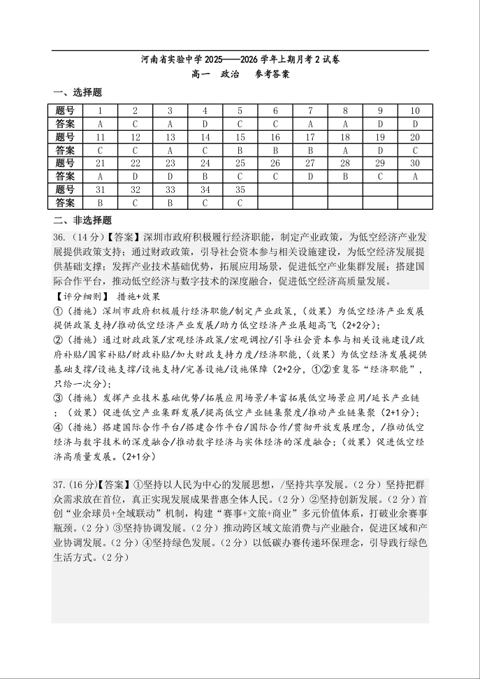 河南省实验中学2025-2026学年高一上学期第二次月考 政治答案.docx