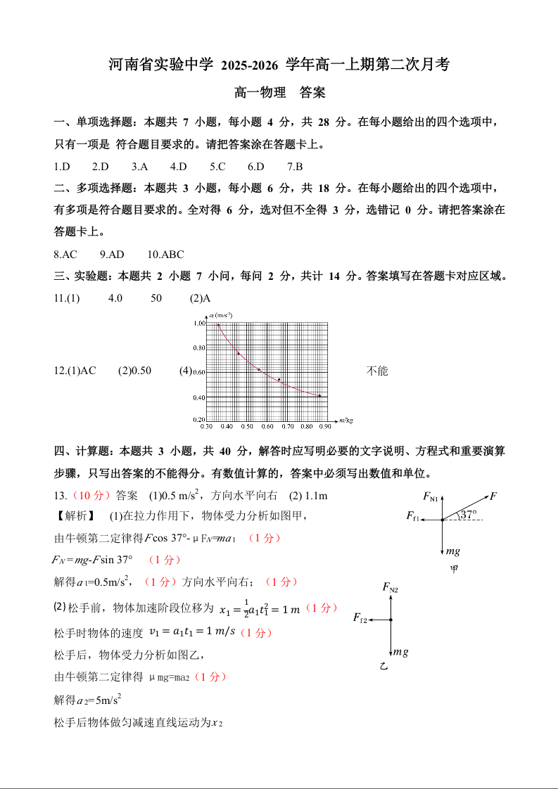 河南省实验中学2025-2026学年高一上学期第二次月考 物理答案.docx