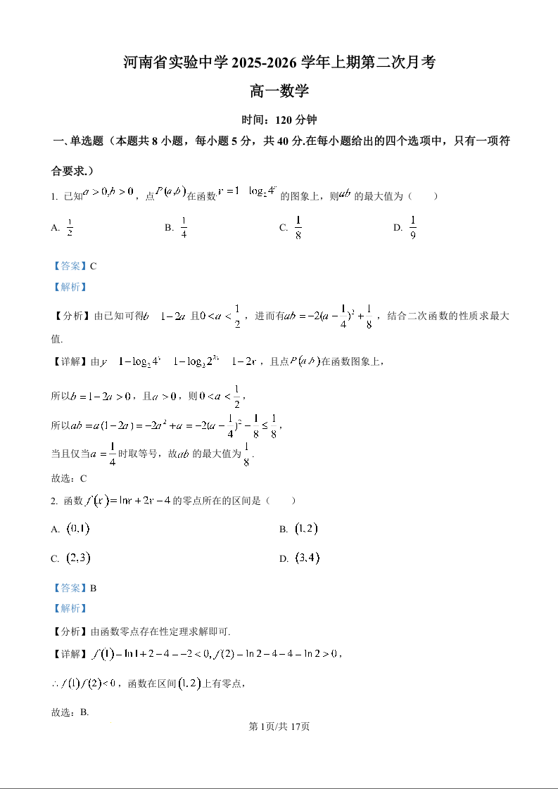 河南省实验中学2025-2026学年高一上学期第二次月考 数学答案.docx