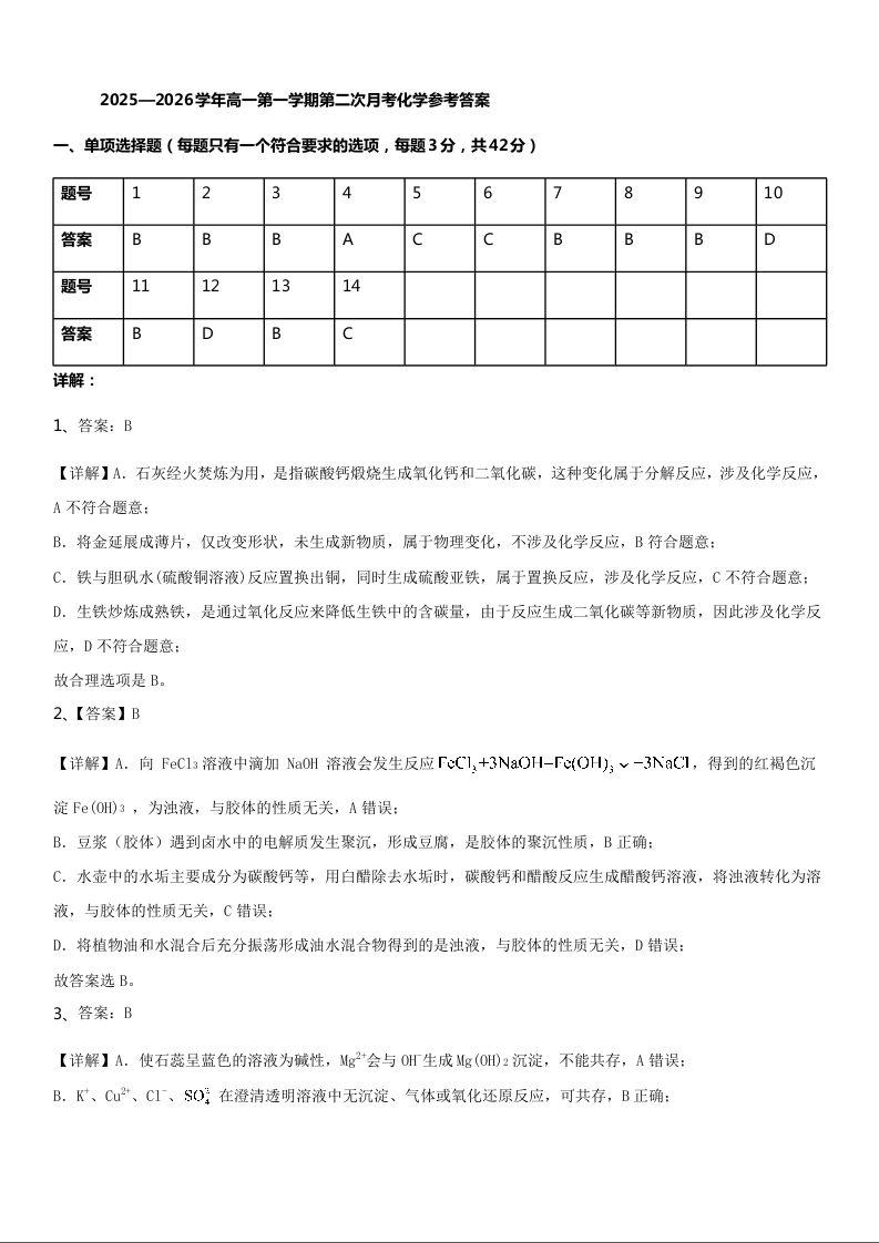 河南省实验中学2025-2026学年高一上学期第二次月考 化学答案.docx