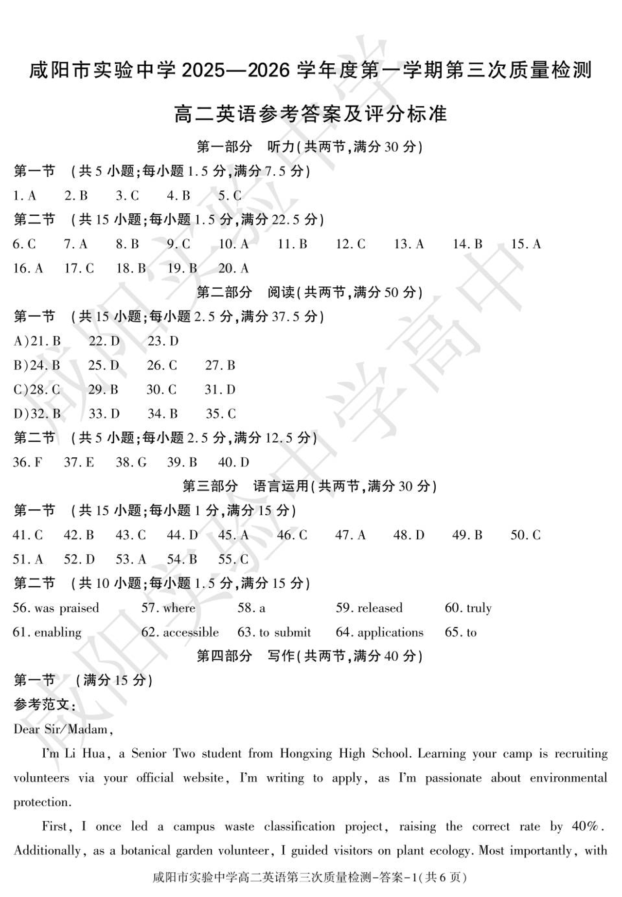 咸阳市实验中学2025-2026学年高二上学期第三次质量检测 英语答案.pdf