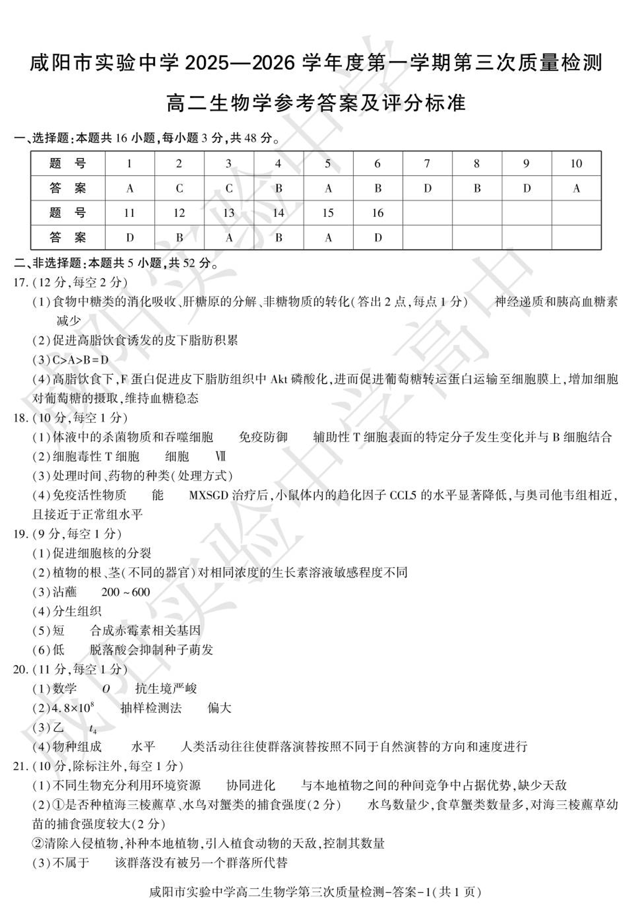 咸阳市实验中学2025-2026学年高二上学期第三次质量检测 生物答案.pdf