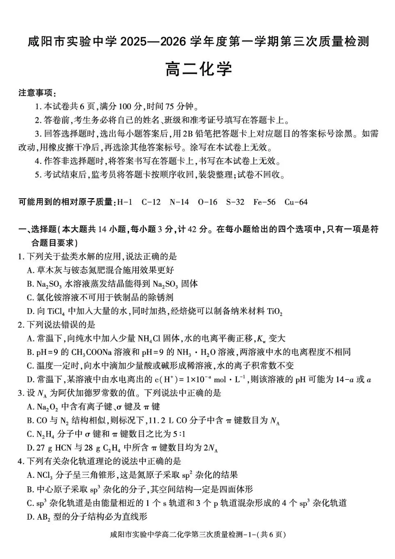 咸阳市实验中学2025-2026学年高二上学期第三次质量检测 化学.pdf