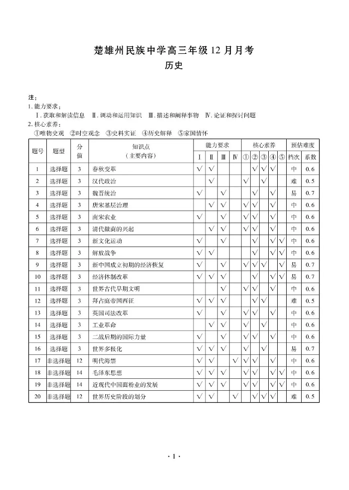 楚雄州民族中学高三年级12月月考 历史答案.pdf
