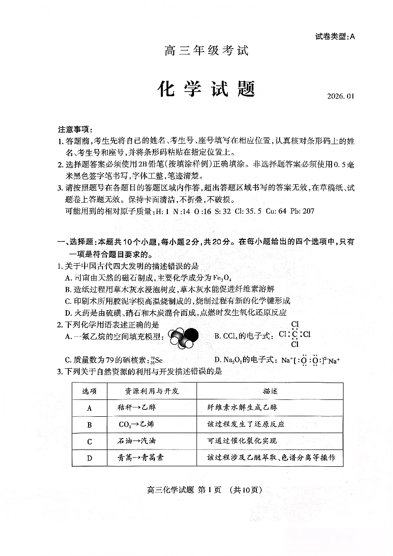 泰安市2026届高三上学期1月期末考试 化学试题(含答案).pdf