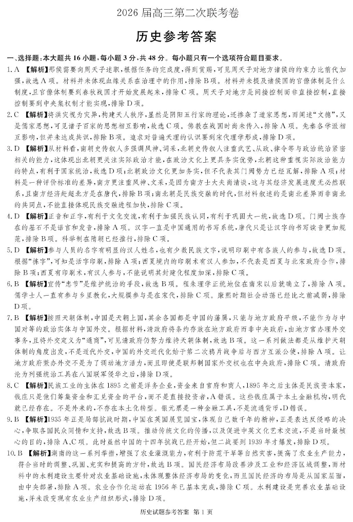湖南佩佩教育战略合作学校2026届高三第二次联考卷 历史答案.pdf