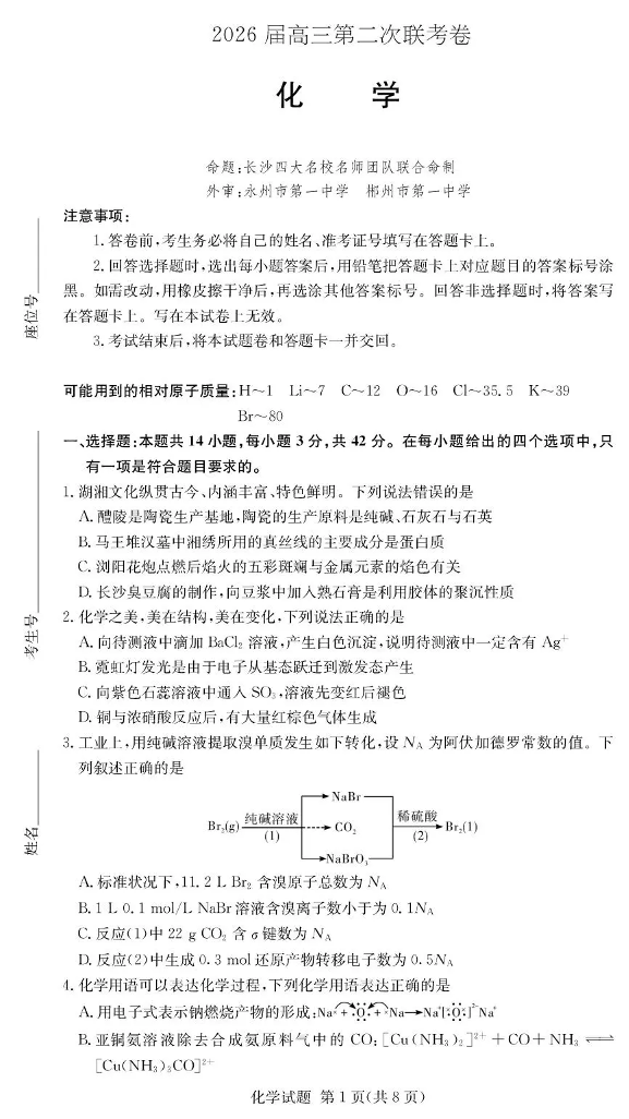 湖南佩佩教育战略合作学校2026届高三第二次联考卷 化学.pdf