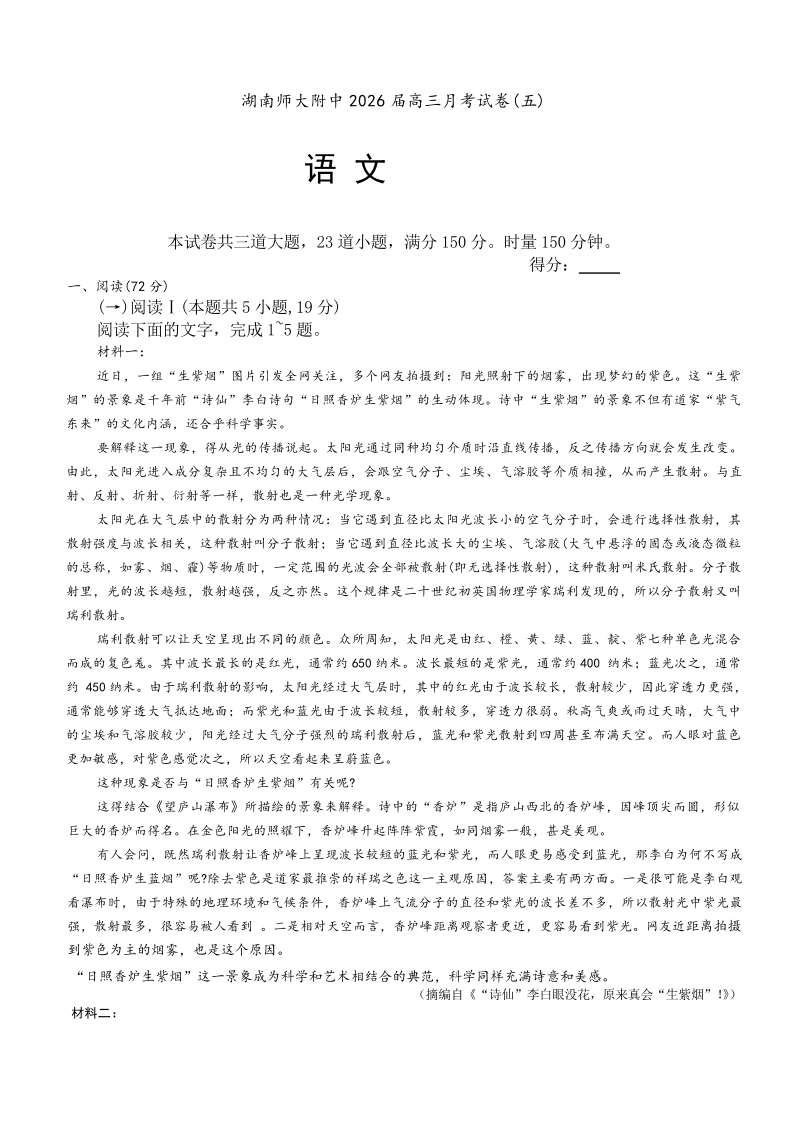 湖南师大附中2026届高三月考试卷(五)语文.pdf