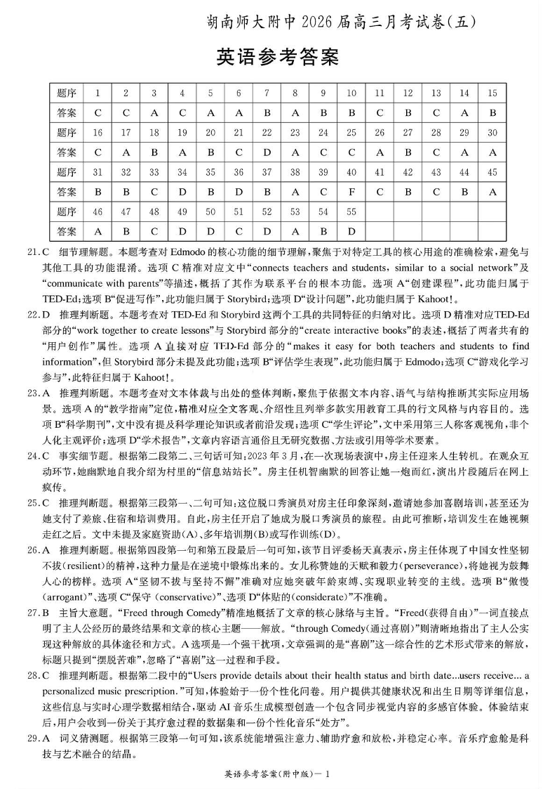 湖南师大附中2026届高三月考试卷(五)英语答案.pdf