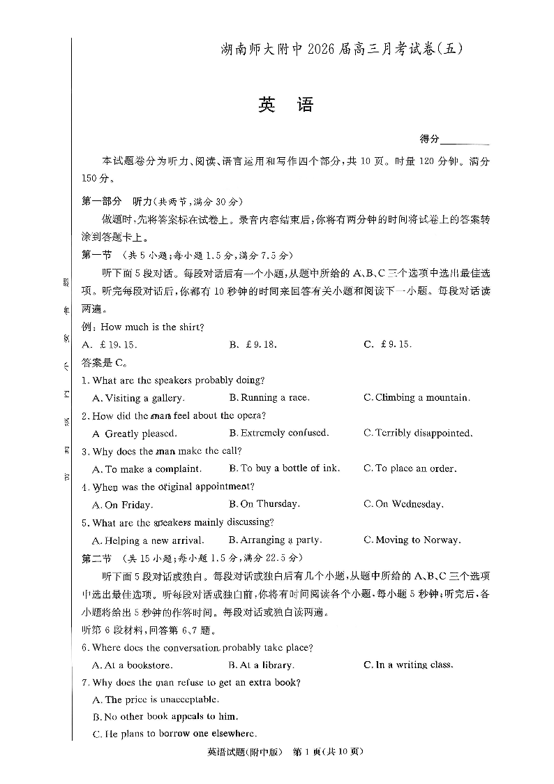 湖南师大附中2026届高三月考试卷(五)英语.pdf