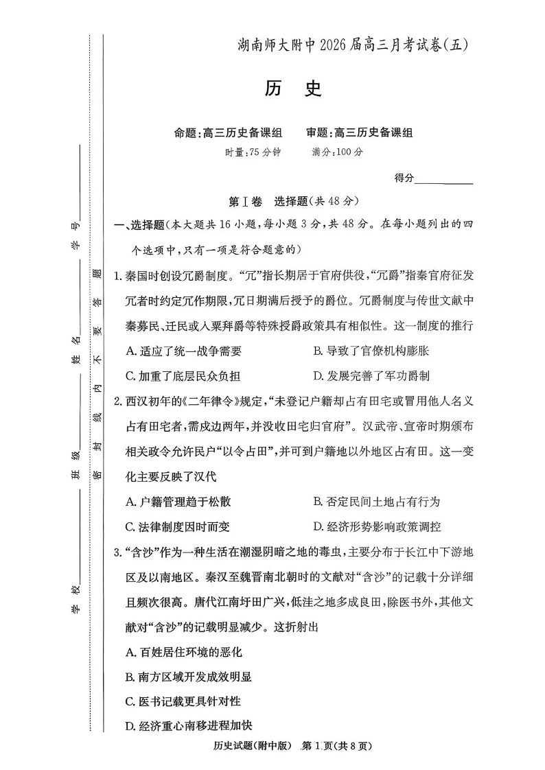 湖南师大附中2026届高三月考试卷(五)历史.pdf