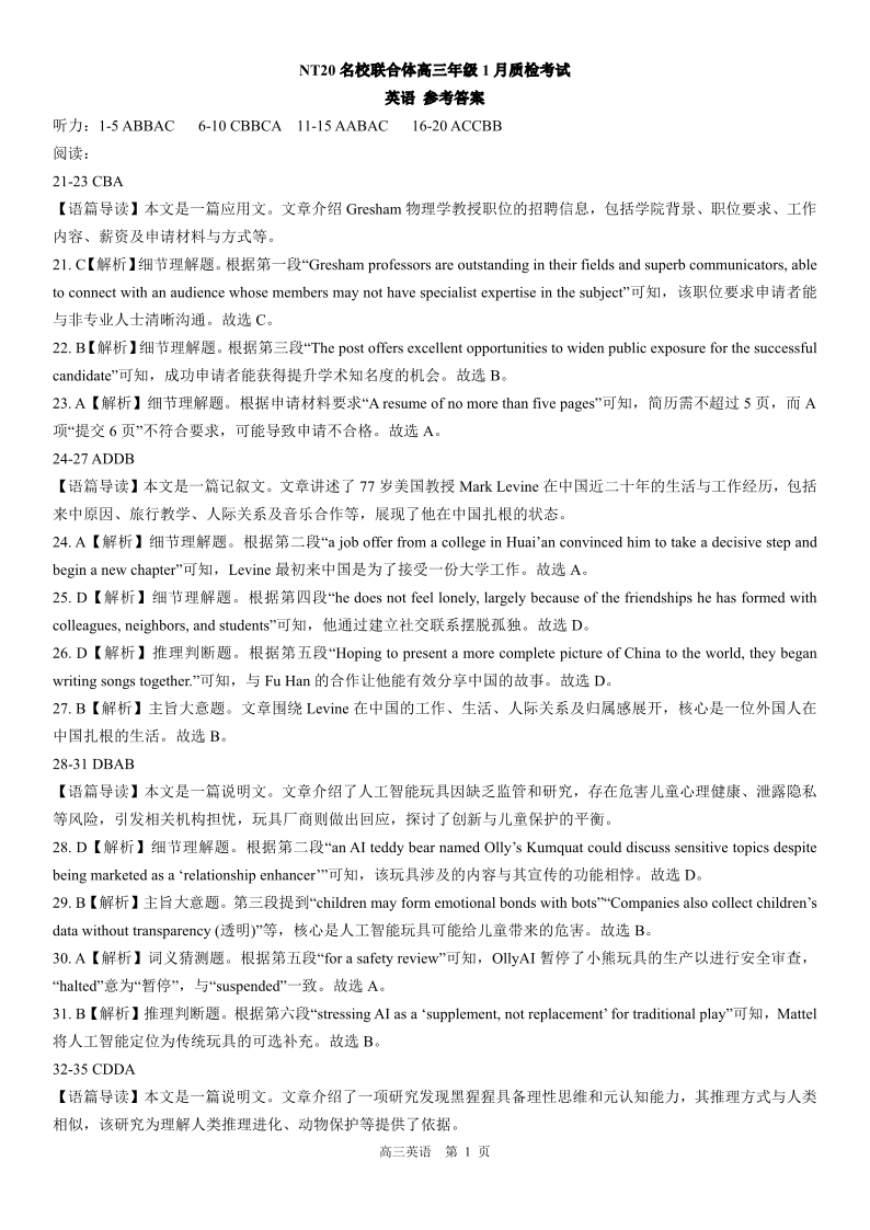 NT20名校联合体高三年级1月质检考试 英语答案.pdf
