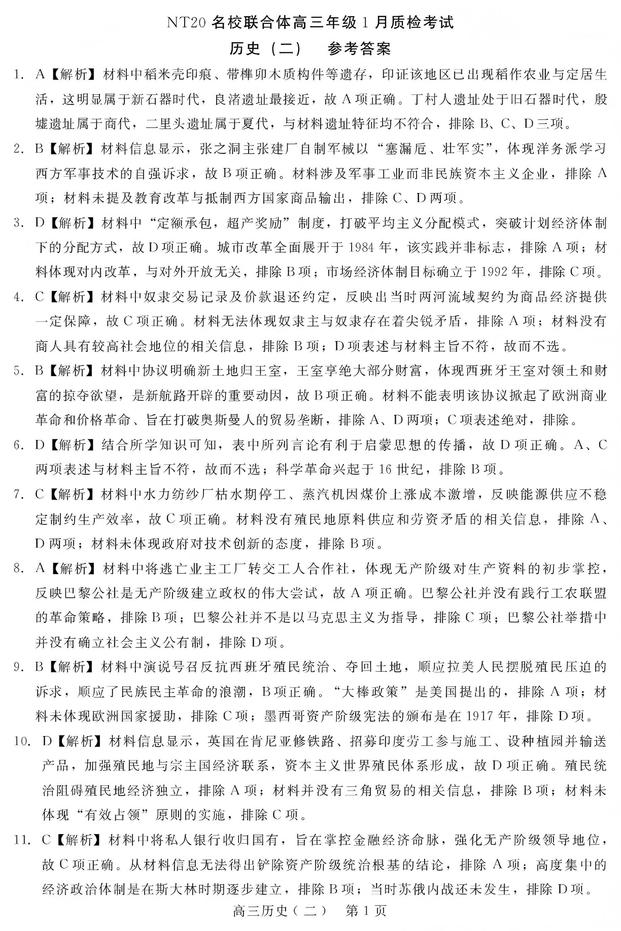NT20名校联合体高三年级1月质检考试 历史答案.pdf