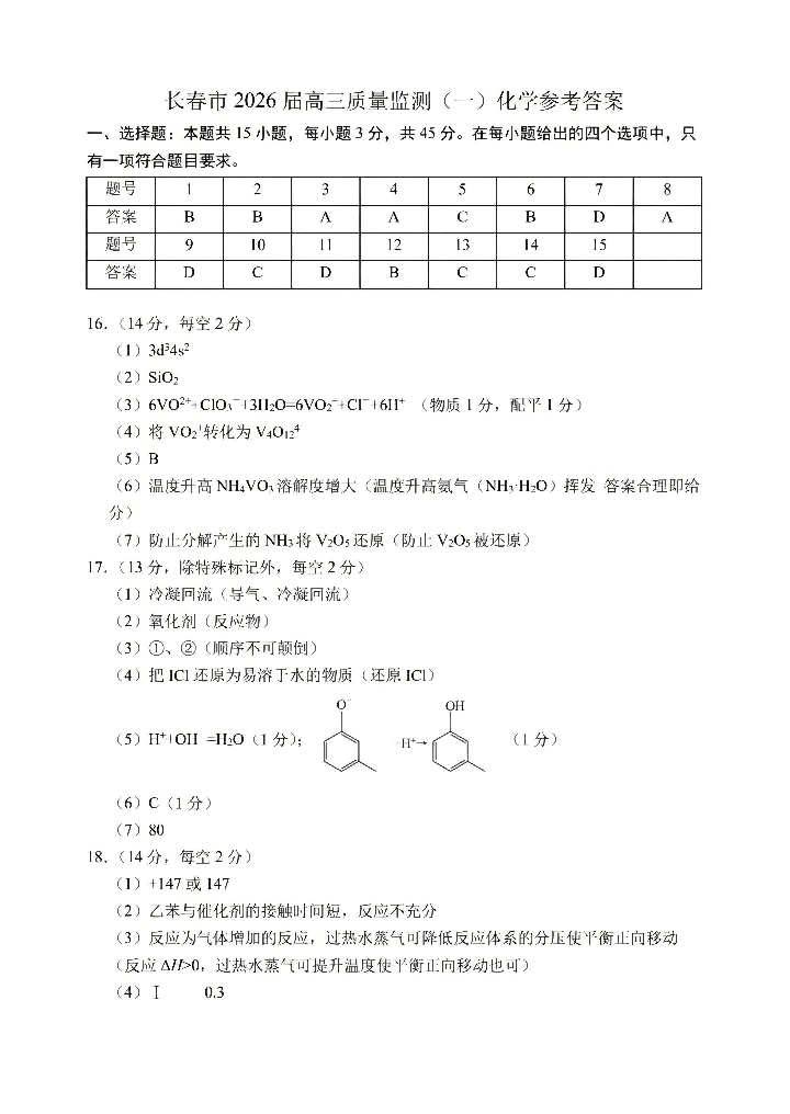 长春市2026届高三质量监测(一)化学答案.pdf