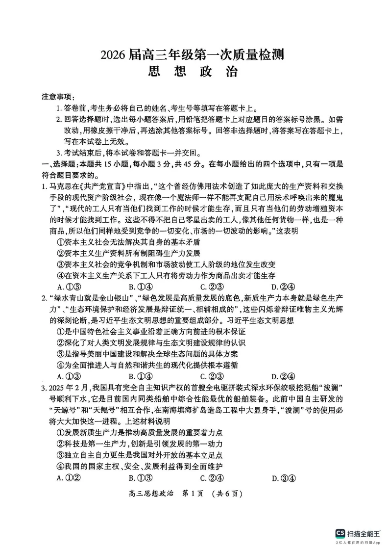 开封市2026届高三年级第一次质量检测 政治.pdf