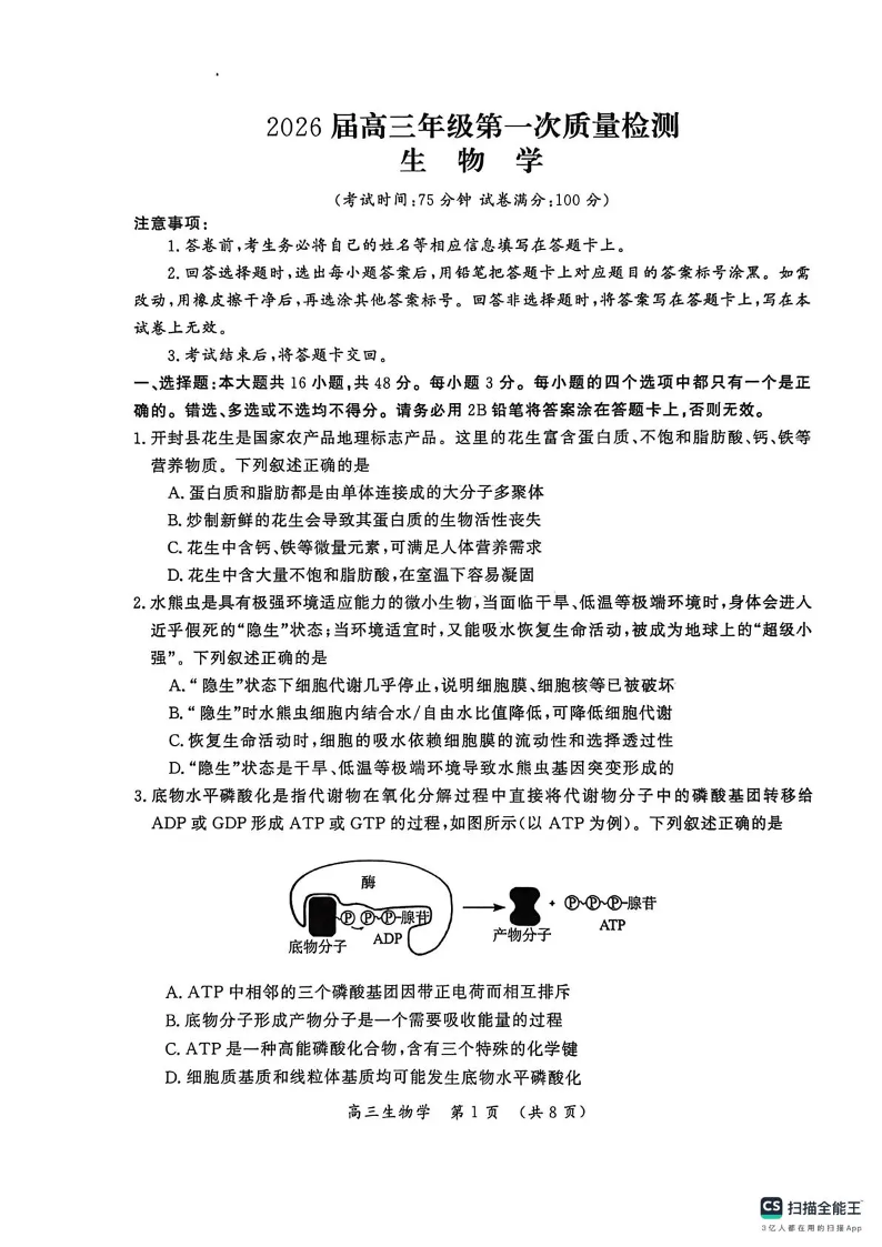 开封市2026届高三年级第一次质量检测 生物.pdf