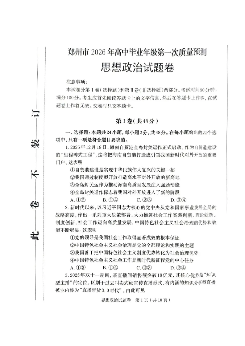 郑州市2026年高中毕业年级第一次质量预测 政治.pdf