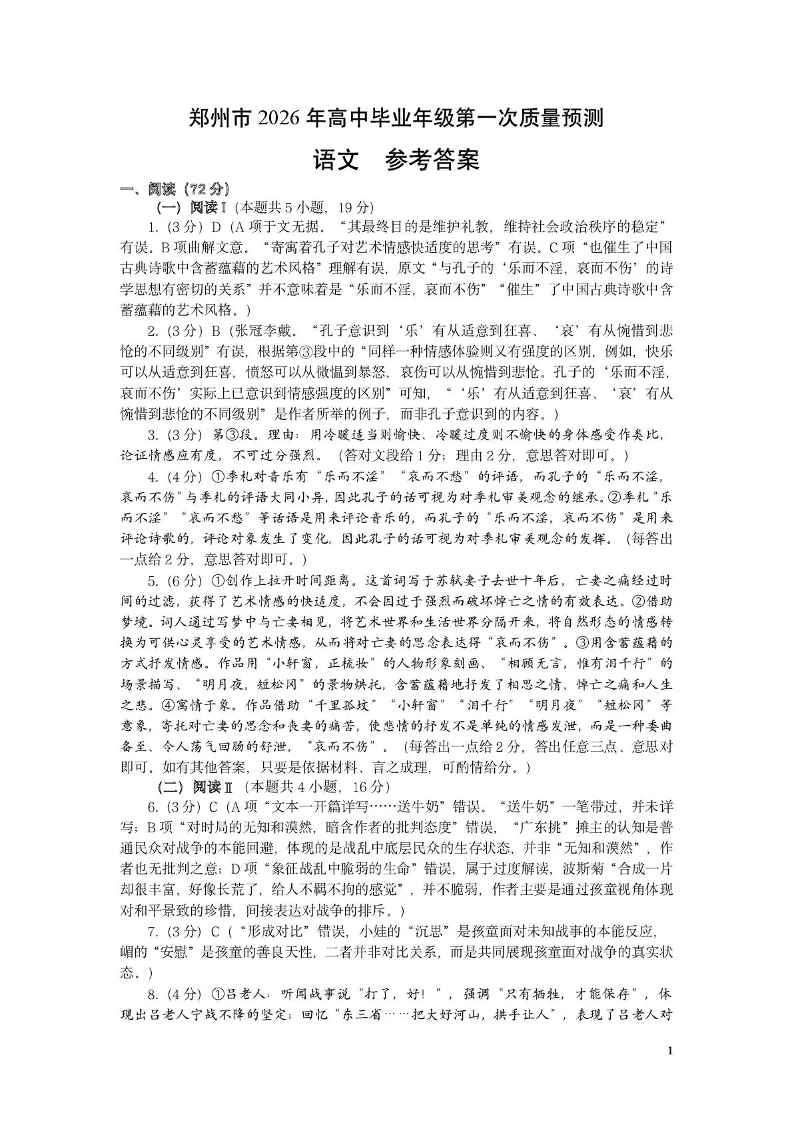 郑州市2026年高中毕业年级第一次质量预测 语文答案.pdf