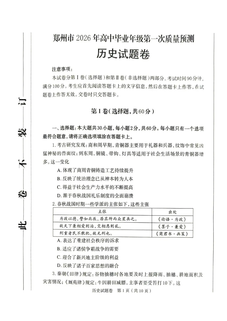 郑州市2026年高中毕业年级第一次质量预测 历史.pdf