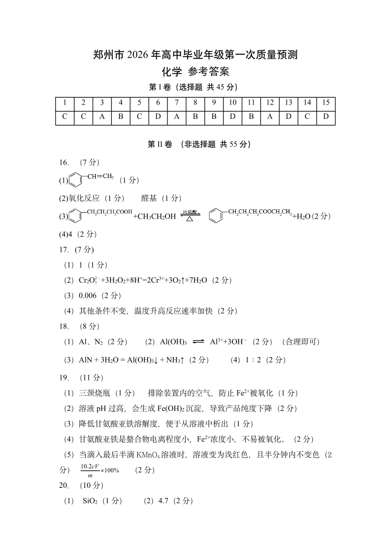 郑州市2026年高中毕业年级第一次质量预测 化学答案.pdf