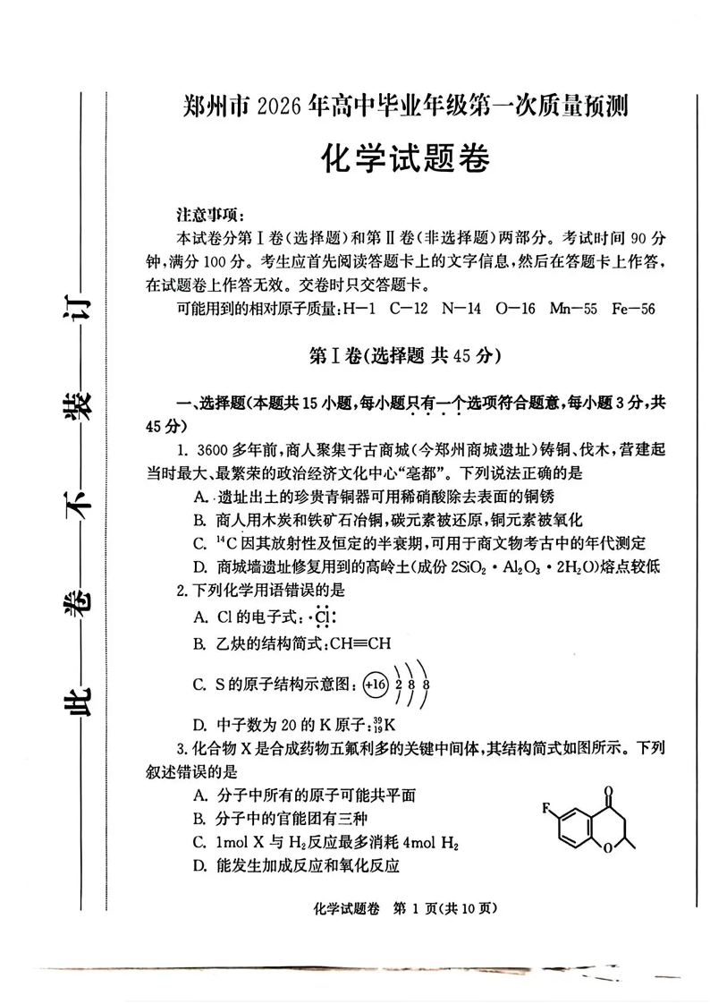 郑州市2026年高中毕业年级第一次质量预测 化学.pdf