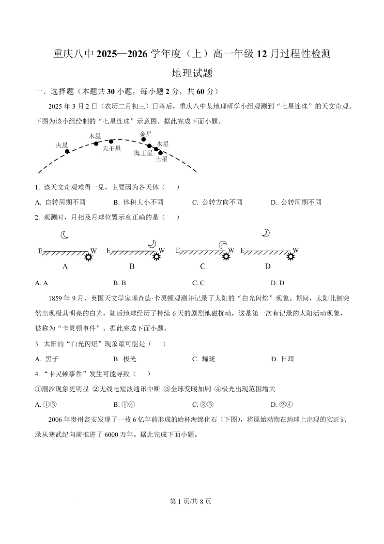 重庆市第八中学2025-2026学年高一上学期12月月考 地理.docx