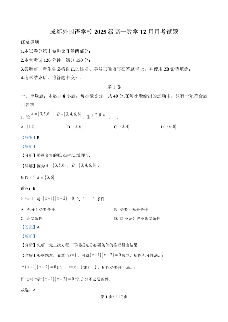 四川省成都外国语学校2025-2026学年高一上学期12月月考 数学答案.docx