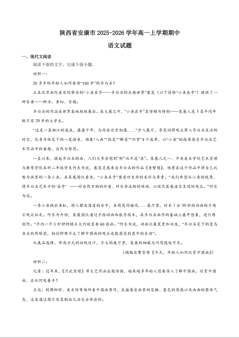陕西省安康市2025-2026学年高一上学期期中联考 语文试题(含答案).docx