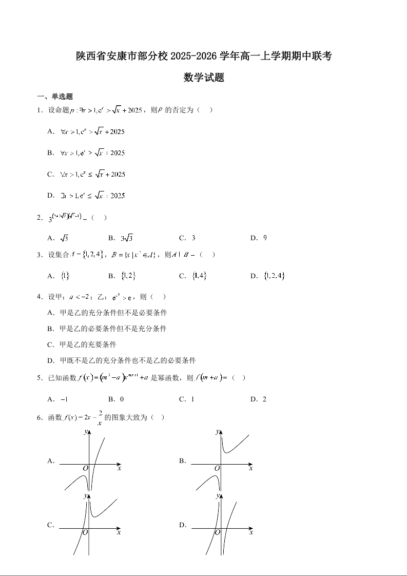 陕西省安康市2025-2026学年高一上学期期中联考 数学试题(含答案).docx