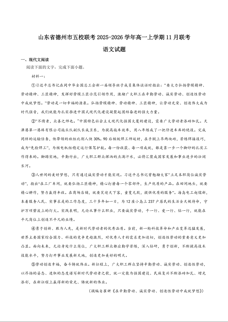 山东省德州市五校2025-2026学年高一上学期期中联考 语文试题(含答案).docx