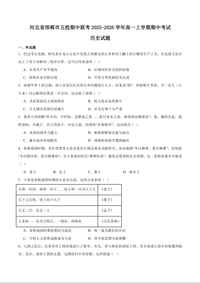 河北省邯郸市五校2025-2026学年高一上学期期中考试 历史试题(含答案).docx