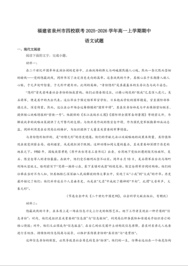 福建省泉州市四校联考2025-2026学年高一上学期期中考试 语文试题(含答案).docx