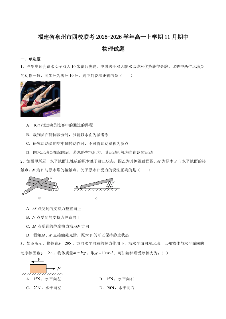 福建省泉州市四校联考2025-2026学年高一上学期期中考试 物理试题(含答案).docx