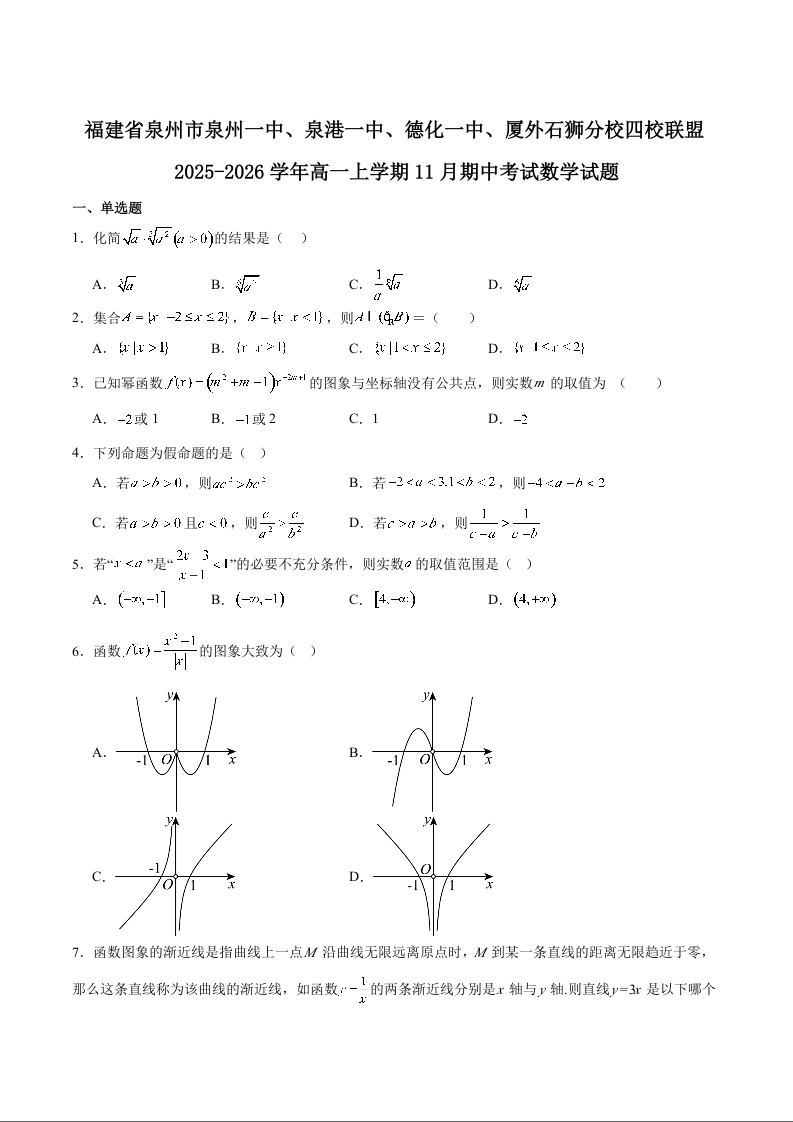 福建省泉州市四校联考2025-2026学年高一上学期期中考试 数学试题(含答案).docx