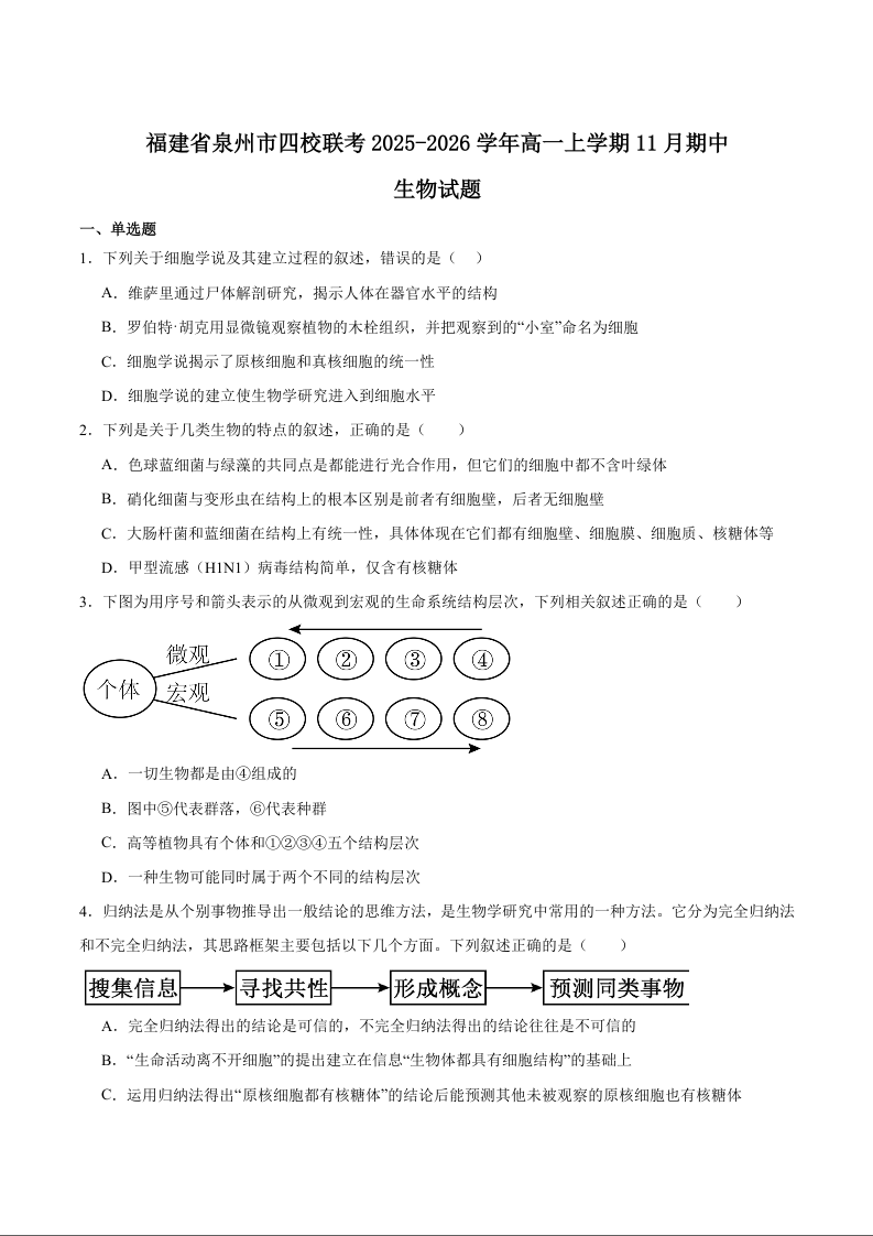 福建省泉州市四校联考2025-2026学年高一上学期期中考试 生物试题(含答案).docx