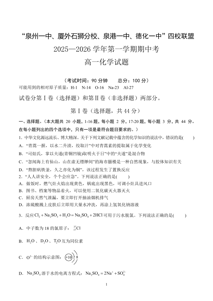 福建省泉州市四校联考2025-2026学年高一上学期期中考试 化学试题(含答案).pdf