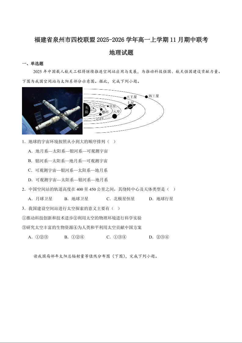 福建省泉州市四校联考2025-2026学年高一上学期期中考试 地理试题(含答案).docx
